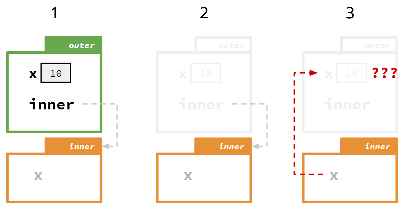 outerรีเทิร์นค่ากลับเป็นฟังก์ชันinner--> ตามหลักการของฟังก์ชัน ถ้ามันรีเทิร์นค่ากลับแล้ว มันจะหยุดการทำงานทันที นั่นแปลว่าตัวแปรxก็จะหายไปด้วยในจังหวะนี้! - พอเราเรียกใช้