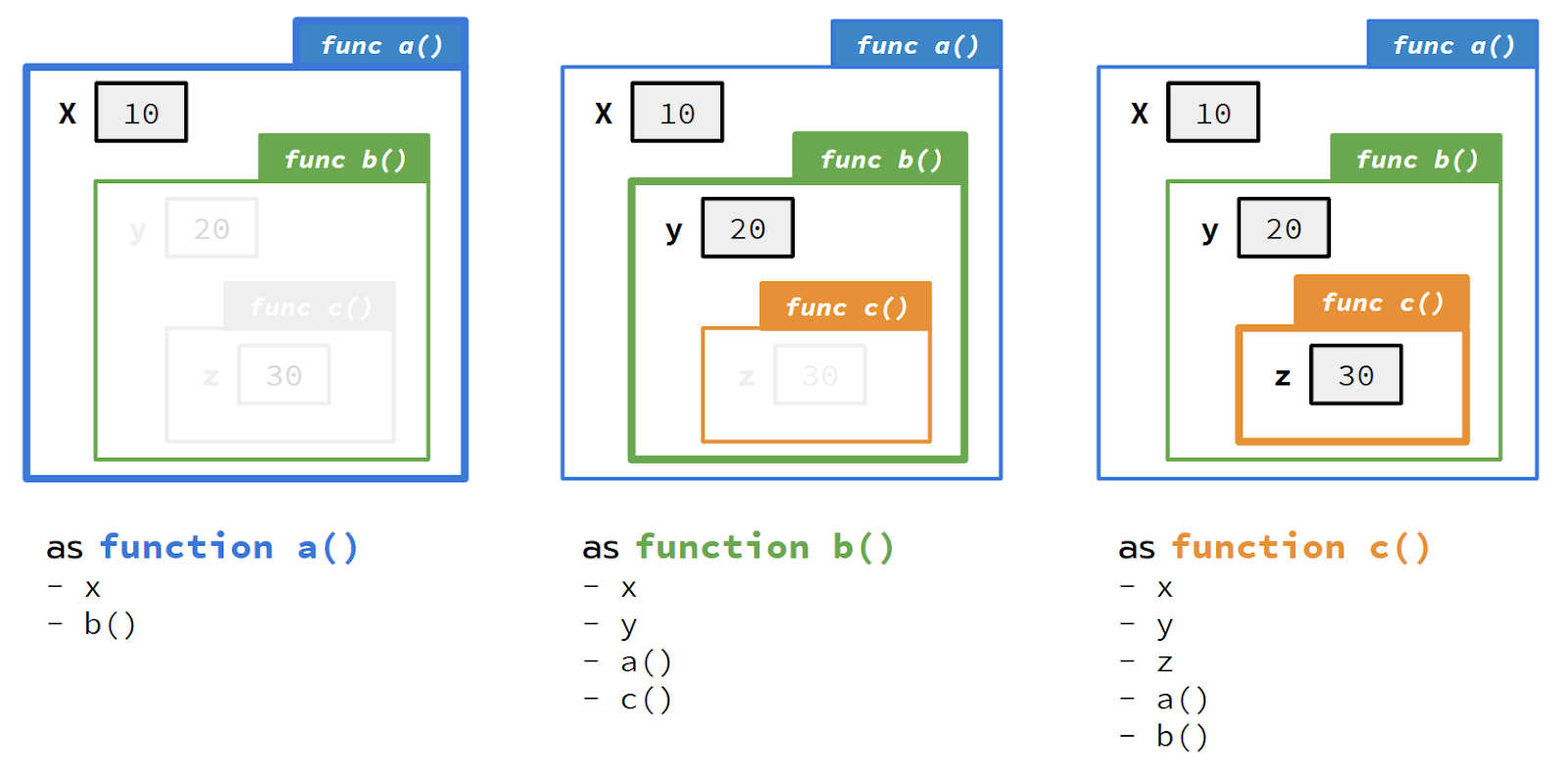 x, y, z // Ok! ฟังก์ชั c สามารถเรียกใช้ตัวแปรได้หมดเลย