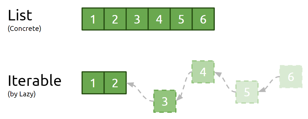• สำหรับ Iterable: เปิดมา ยังไม่ทำอะไรทั้งนั้นแหละ (Lazy) แต่เมื่อมีการเรียกไอเทม elementAt(0) มันพบว่าไอเทมตัวที่ 0 น่ะยังไม่ถูกสร้างขึ้นมาเลย แต่เขาจะใช้งานแล้วนี่นา -> งั้นก็สร้างซะตอนนี้เลย!