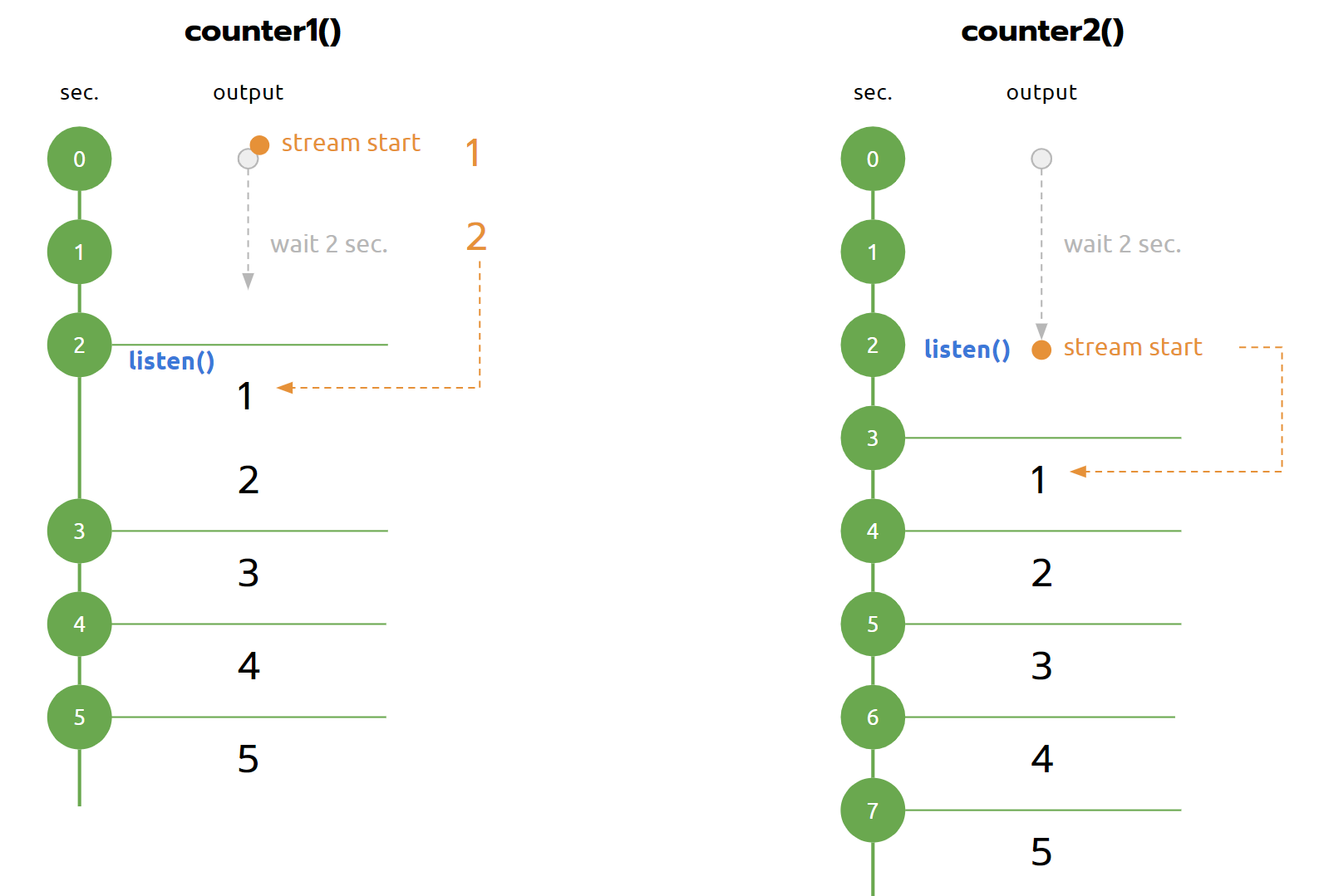สำหรับการใช้งาน Stream นั้นมันจะทำงานทันที แม้ว่าจะยังไม่มีใครมารอ listen มันเลยก็ตาม